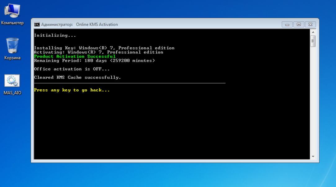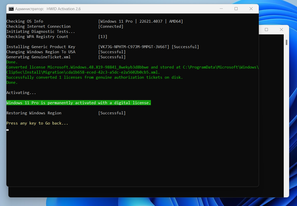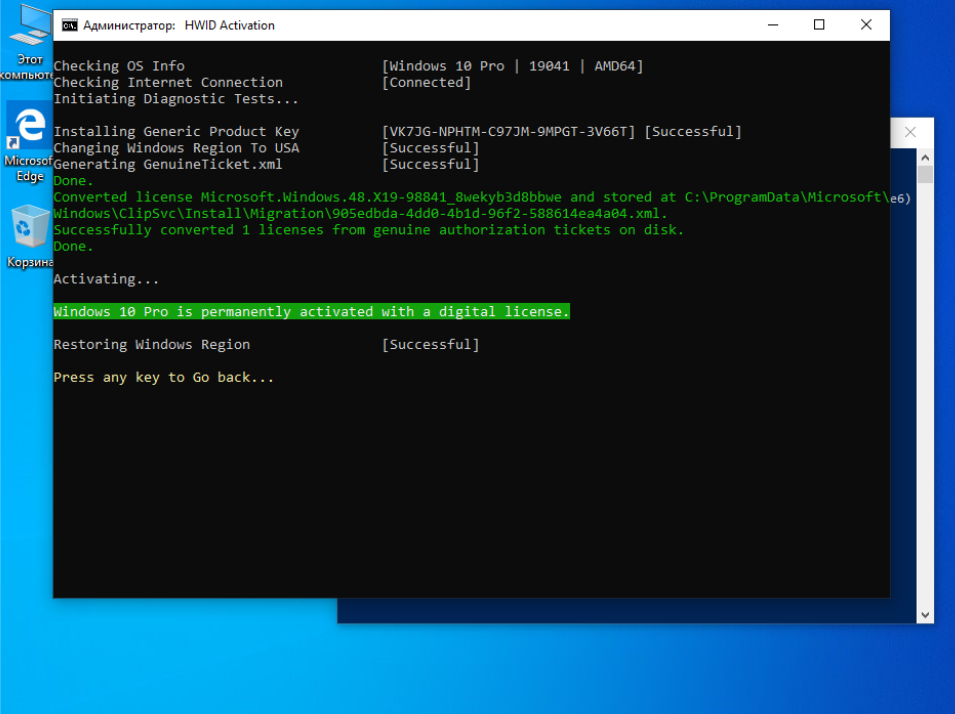 - По завершению активации вы увидите данную информацию, теперь окна консоли и PowerShell можно закрыть: