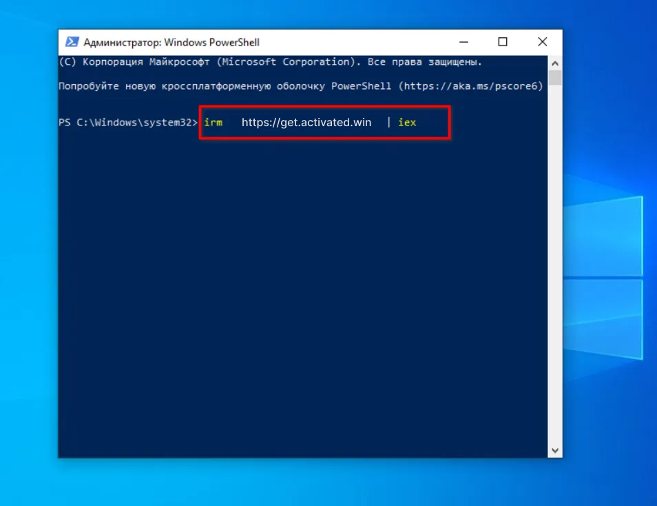 - В открывшимся PowerShell введите команду irm https://get.activated.win | iex и нажмите enter (путь, отображающийся после PS C://, не имеет значения и может быть любым):