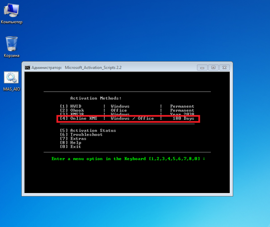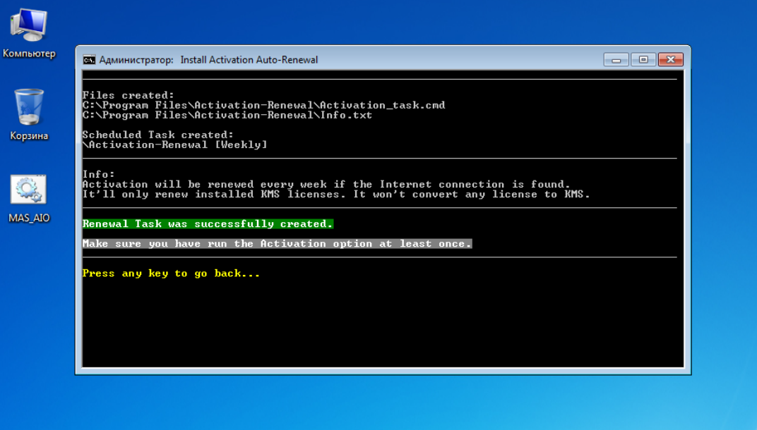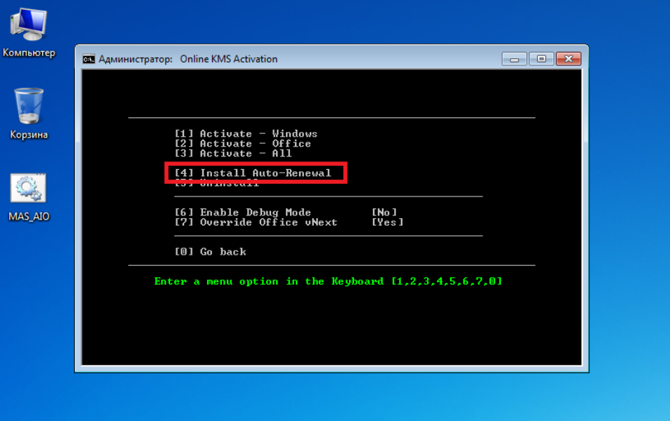 - Чтобы активация работала бессрочно, необходимо в планировщике задач создать задачу на автоматическую переактивацию. Для этого нажмите любую клавишу, чтобы вернуться обратно, и выберите 4-ый пункт, нажав клавишу 4: