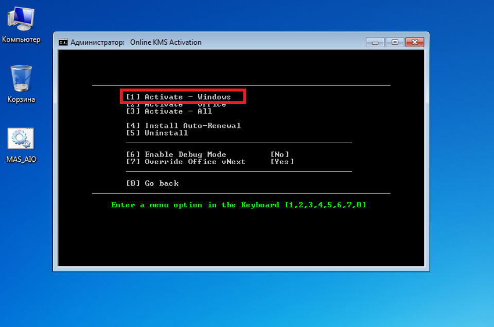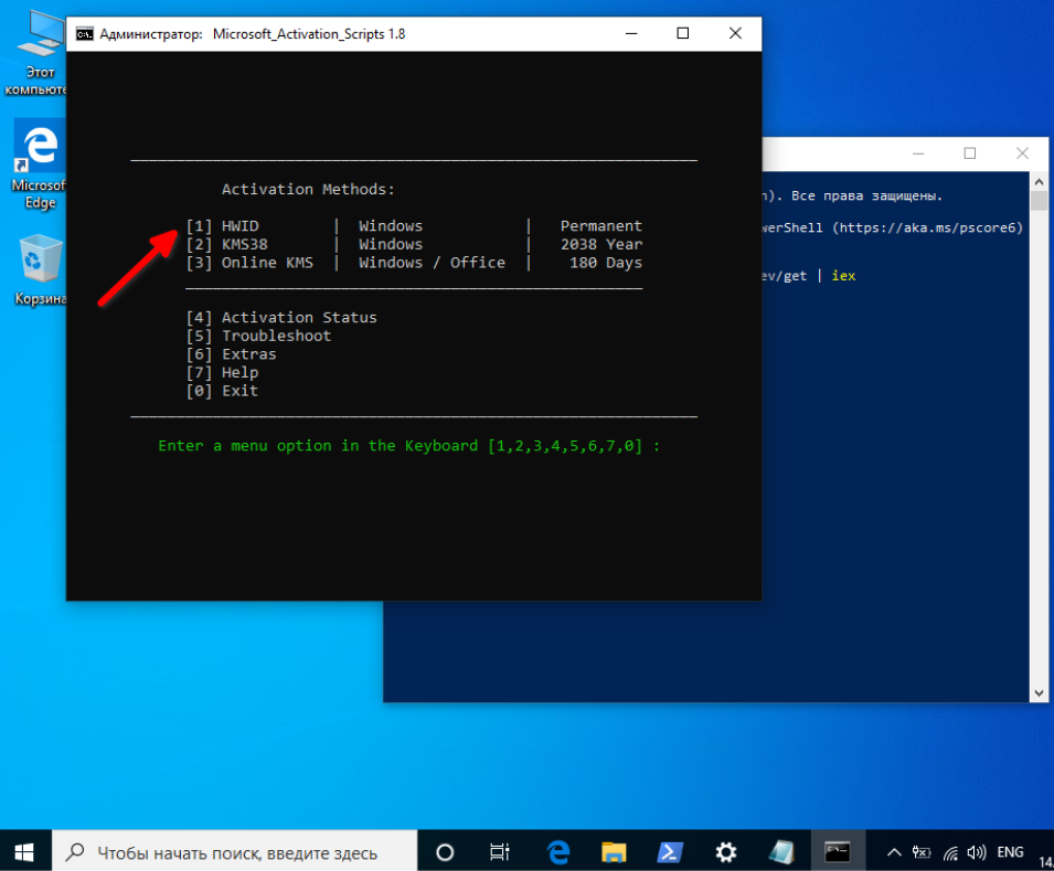 2. Возникает ошибка “Невозможно разрешить удалённое имя ‘massgrave.dev’” (или get.activated.win - тут всё аналогично)- Запустится процесс установки активации. На одном из этапов вам будет предложено выбрать мод активации - нажмите цифру 1: