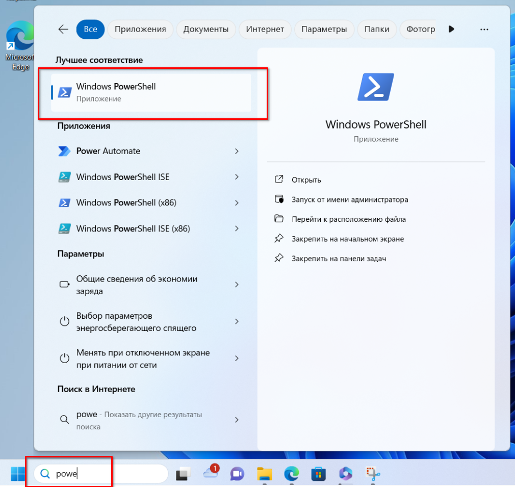 - Чтобы активировать Windows, введите в поиск PowerShell и в предложенных найденных вариантах запустите данную утилиту от имени администратора: